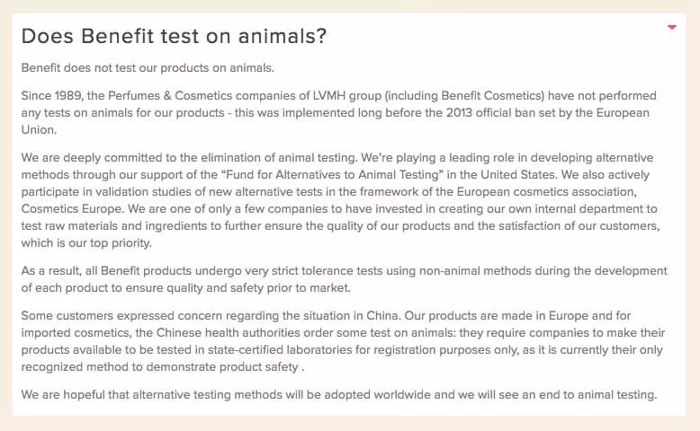 Benefit afirma que el grupo LVMH, incluyendo Benefit, no ha realizado pruebas en animales en sus productos desde 1989 en general. Sin embargo, esta afirmación se contradice con su historial de pagar por pruebas en animales en mercados como China donde eran/son obligatorias.