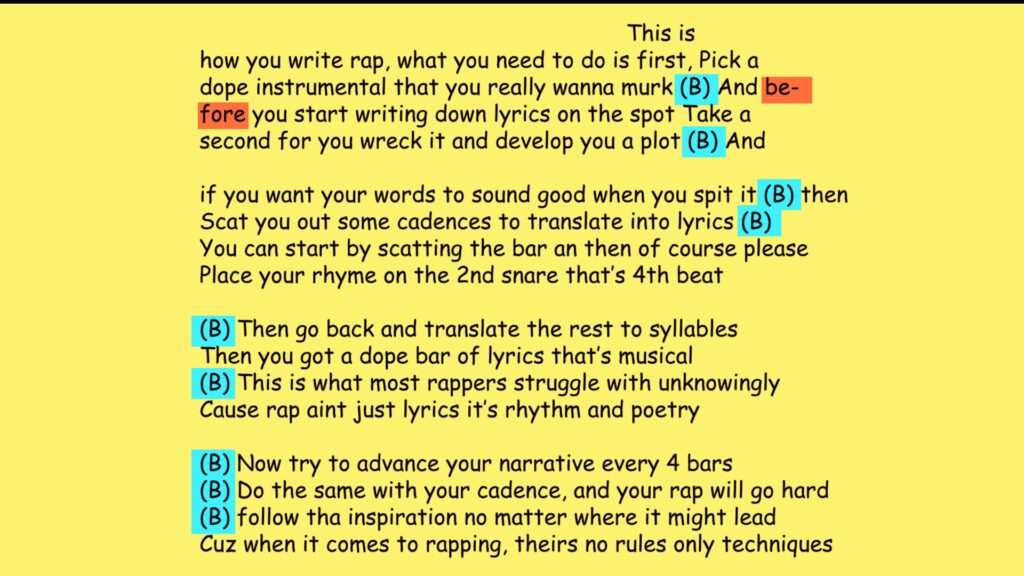 El esquema de rima determina dónde colocarás tus rimas dentro de la letra. El esquema más tradicional en el rap es el AABB, donde la última palabra de una línea rima con la última palabra de la línea siguiente. Un ejemplo clásico es "The Message" de Grandmaster Flash: