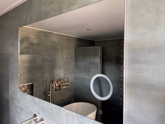 - Tiras de luz alrededor del espejo: Una tira continua de luces (especialmente LED) alrededor de todo el perímetro del espejo, similar a las luces de un tocador de camerino, también proporciona una iluminación muy uniforme.