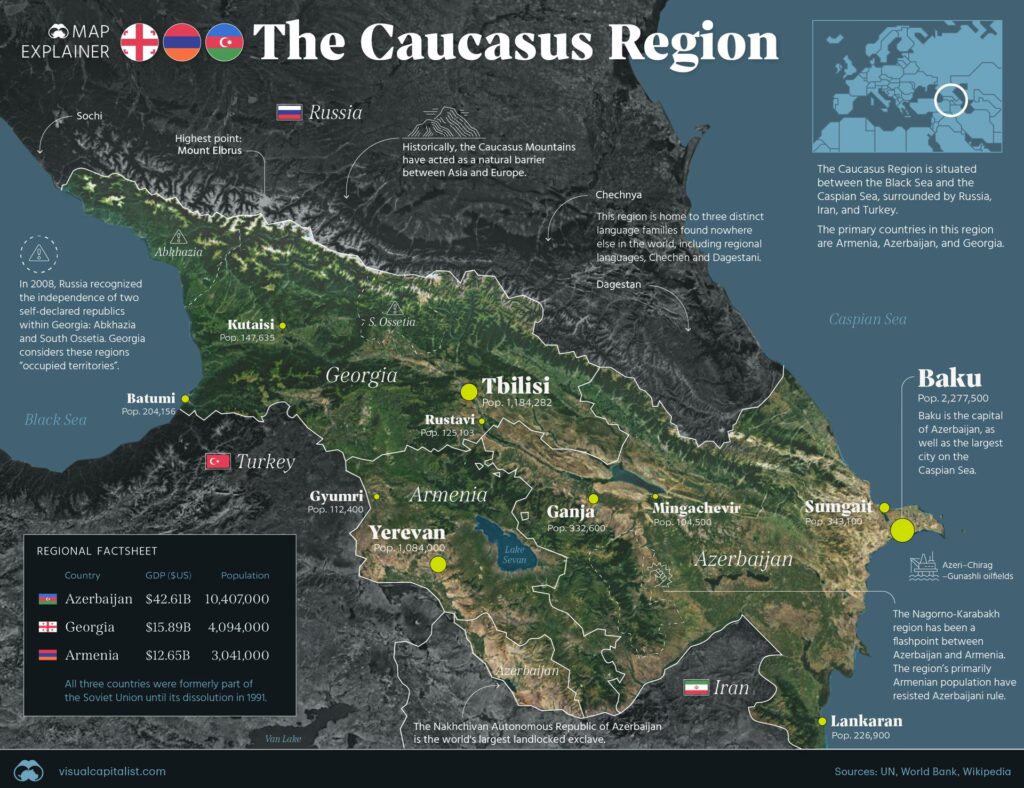 El Cáucaso no es una entidad política única, sino una región que abarca varios países independientes y partes de otros. Los principales estados soberanos que se encuentran completamente dentro del Cáucaso Meridional son: