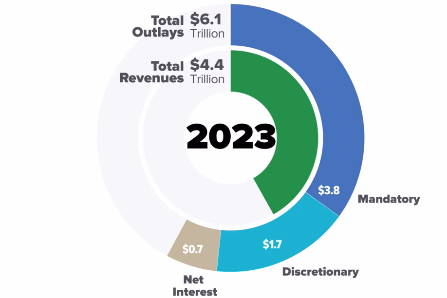 Las tres categorías principales son: gasto obligatorio, gasto discrecional e interés sobre la deuda federal.